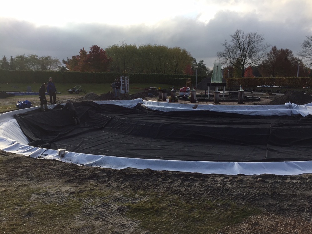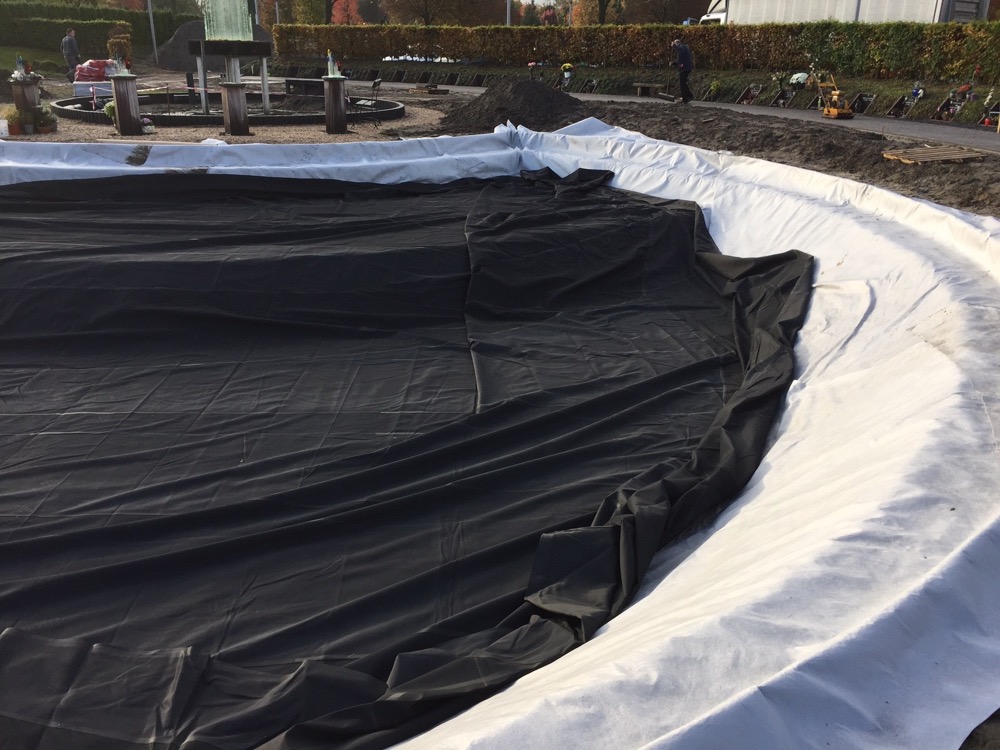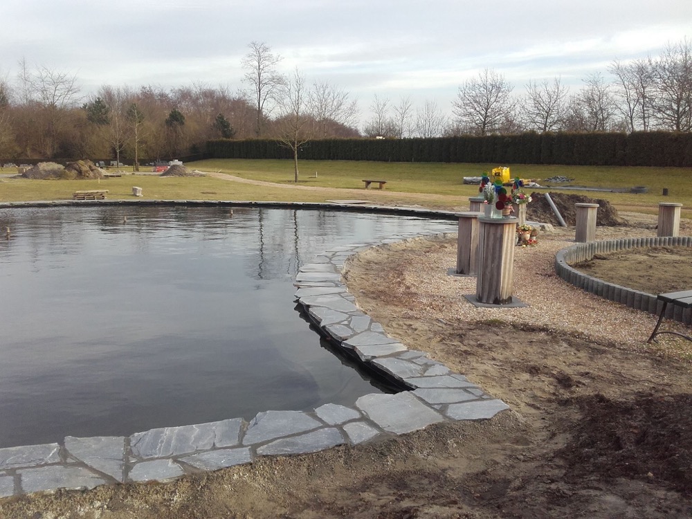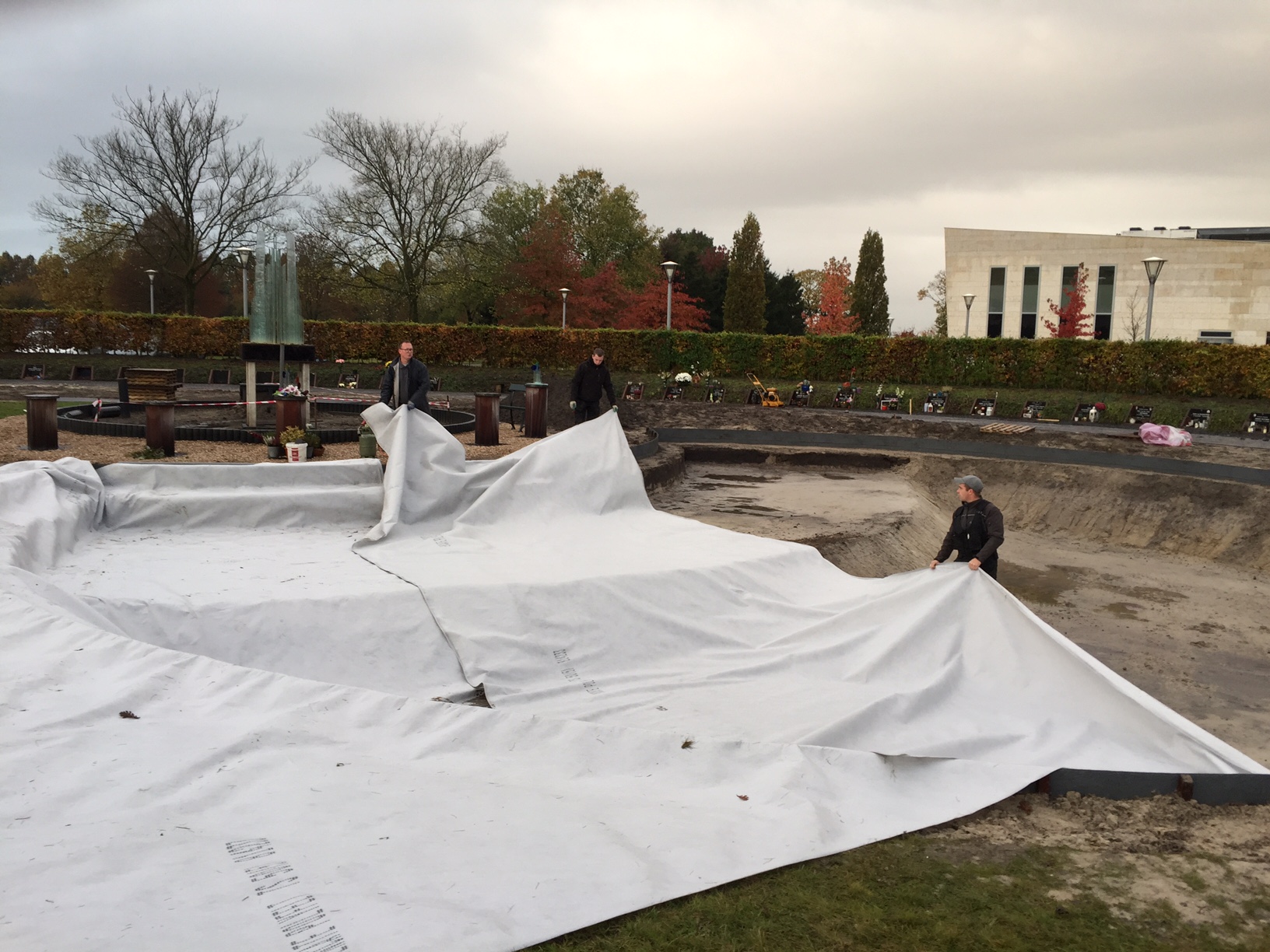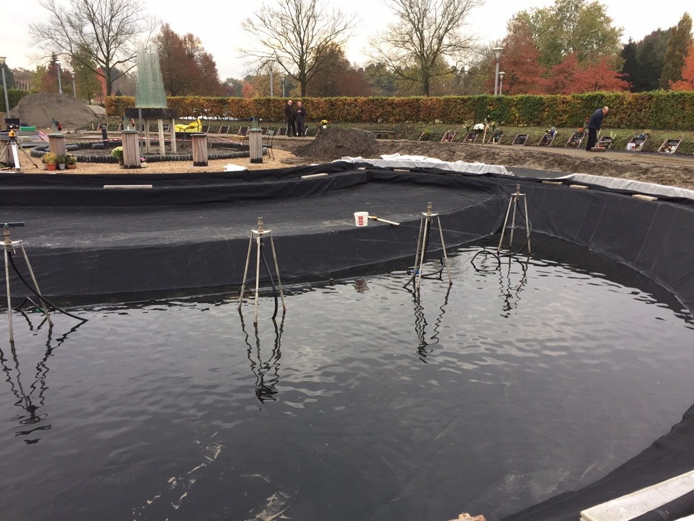 Renovatie van vijver bij het crematorium te Roosendaal: Membraan oppervlakte 500m2 en 400m3 inhoud.