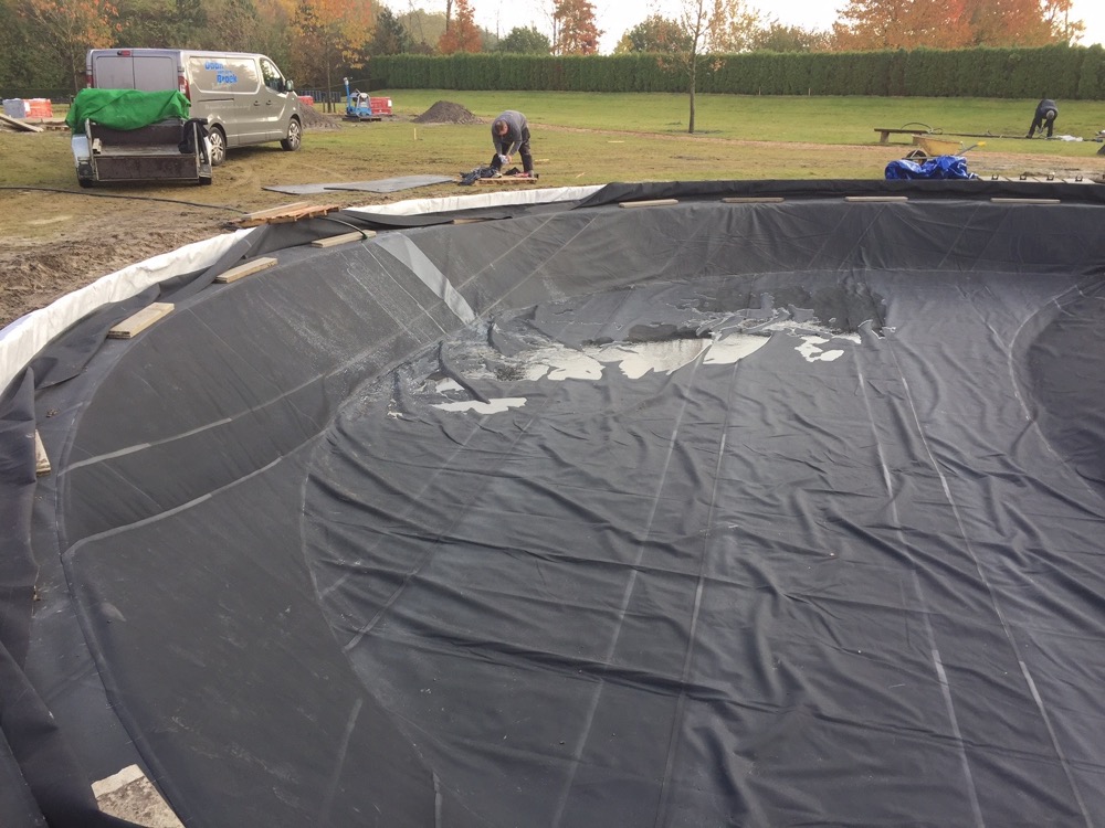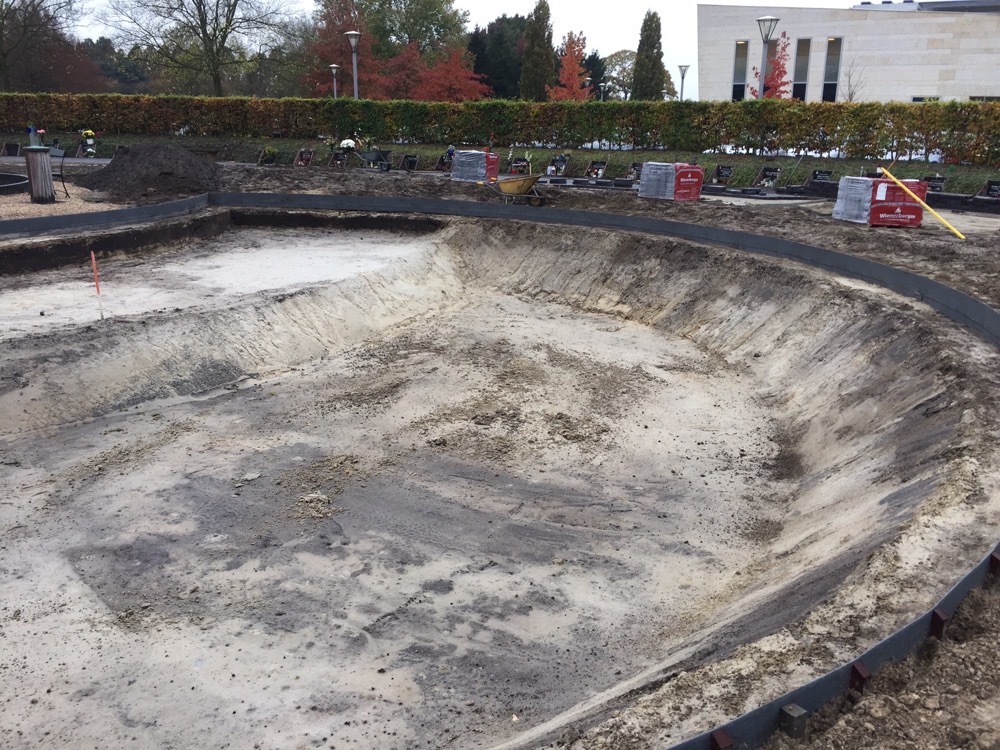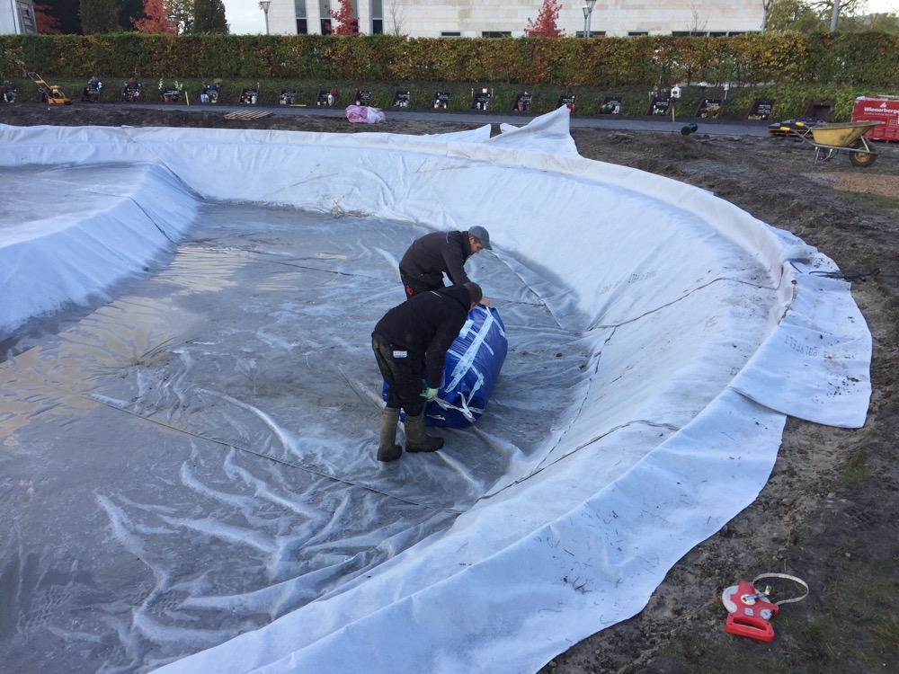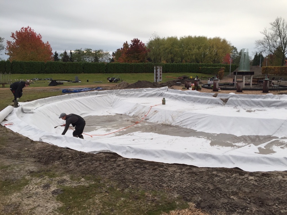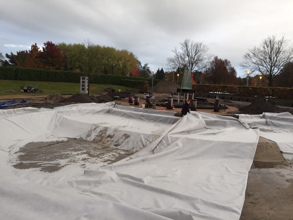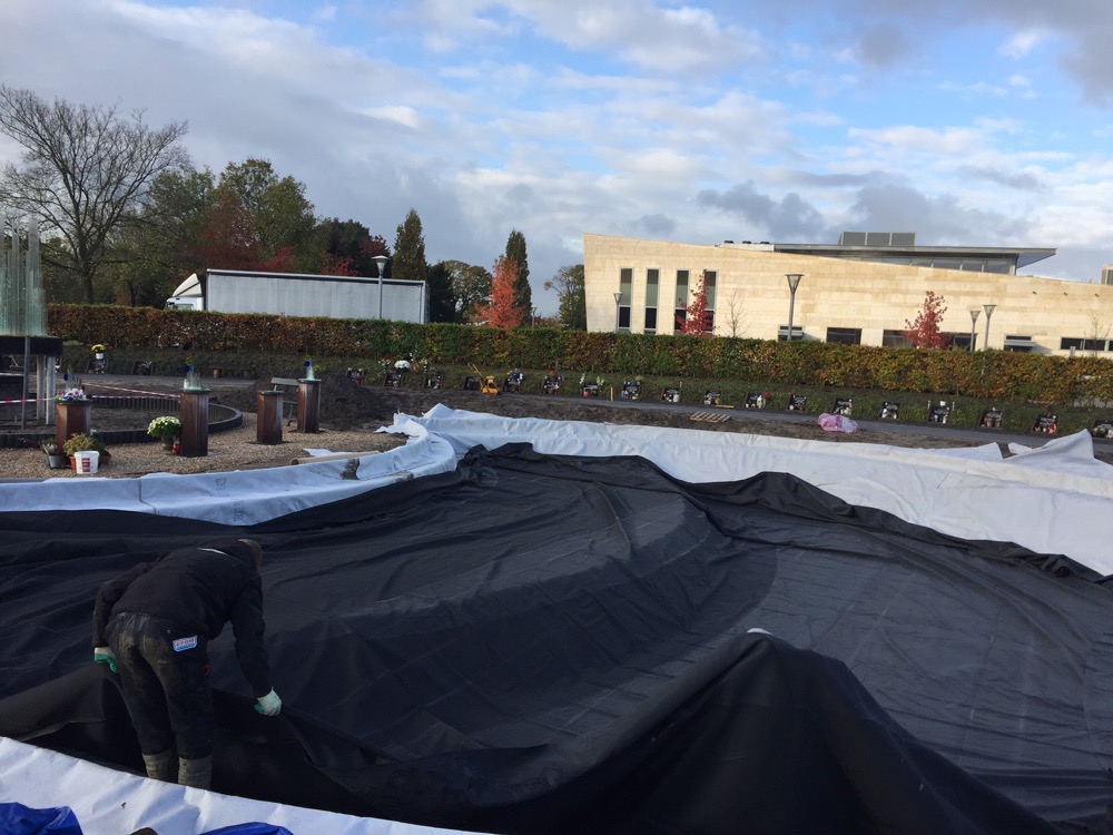 Renovatie van vijver bij het crematorium te Roosendaal: Membraan oppervlakte 500m2 en 400m3 inhoud.